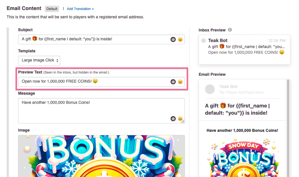 Email inboxes show additional text with the subject line. You can edit this text in the Teak Dashboard. Look for the field labeled Preview Text.