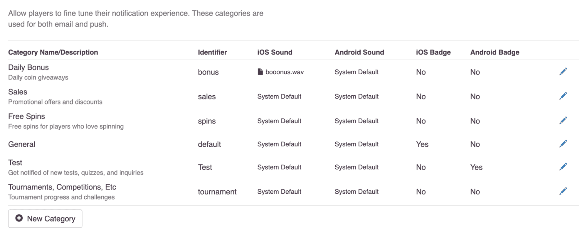 You can now define categories for your push and email messages. By allowing players to control the types of content they receive, you give them a way to opt-out of just the content they don't want rather than opting out of everything.