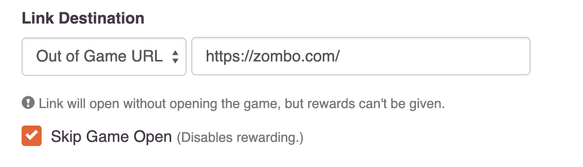 In the message edit interface, you'll see a new Link Destination section. Choose "Out of Game URL" in the dropdown and notice the Skip Game Open checkbox. When you check this box, players will go directly from their email to the URL without a game launch in between.