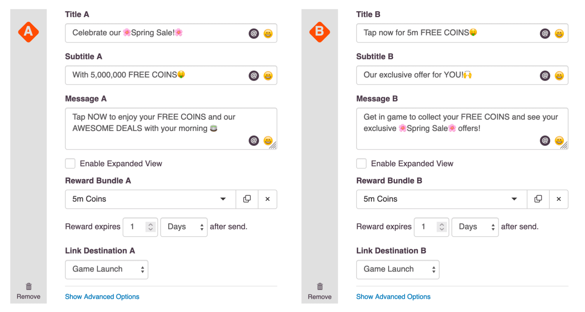 If you've ever wondered whether one sentence might get someone to tap one notification over another, then run a test! Use Teak's A/B testing feature to send the same notification to the same people but with different wording. For example, you could test whether it's better to say, "Tap now for free coins" or "Free coins in game now" by using the A/B feature.