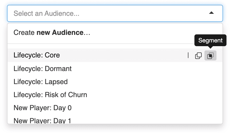 In the Audience Builder select, "Players whose Audiences are any of…" and select the audiences you want to start from. From there you can add additional filters to narrow down your segment. Or, you can use the 'Segment' option in the dropdowns for the Audience you want to segment. This will open the Audience Builder pre-populated with the selected audience.
